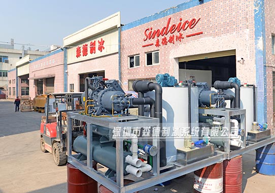 片冰機通電運行,制冷劑(冷媒)通過壓縮機的做功變成高溫高壓的蒸汽工質(zhì),再流入冷凝器與外界換熱,放出熱量變成高壓液態(tài)工質(zhì),流經(jīng)過濾器過濾后通過膨脹閥降壓降溫為汽液混合狀態(tài),然后進入蒸發(fā)器,與片冰機蒸發(fā)器內(nèi)壁上的水進行熱交換,吸收大量的熱,使水急劇降到結(jié)冰點以下溫度,瞬速結(jié)冰。此時制冷劑經(jīng)過吸收熱量后蒸發(fā)成為氣態(tài),被吸入壓縮機內(nèi)進行循環(huán),從而實現(xiàn)循環(huán)制冷。